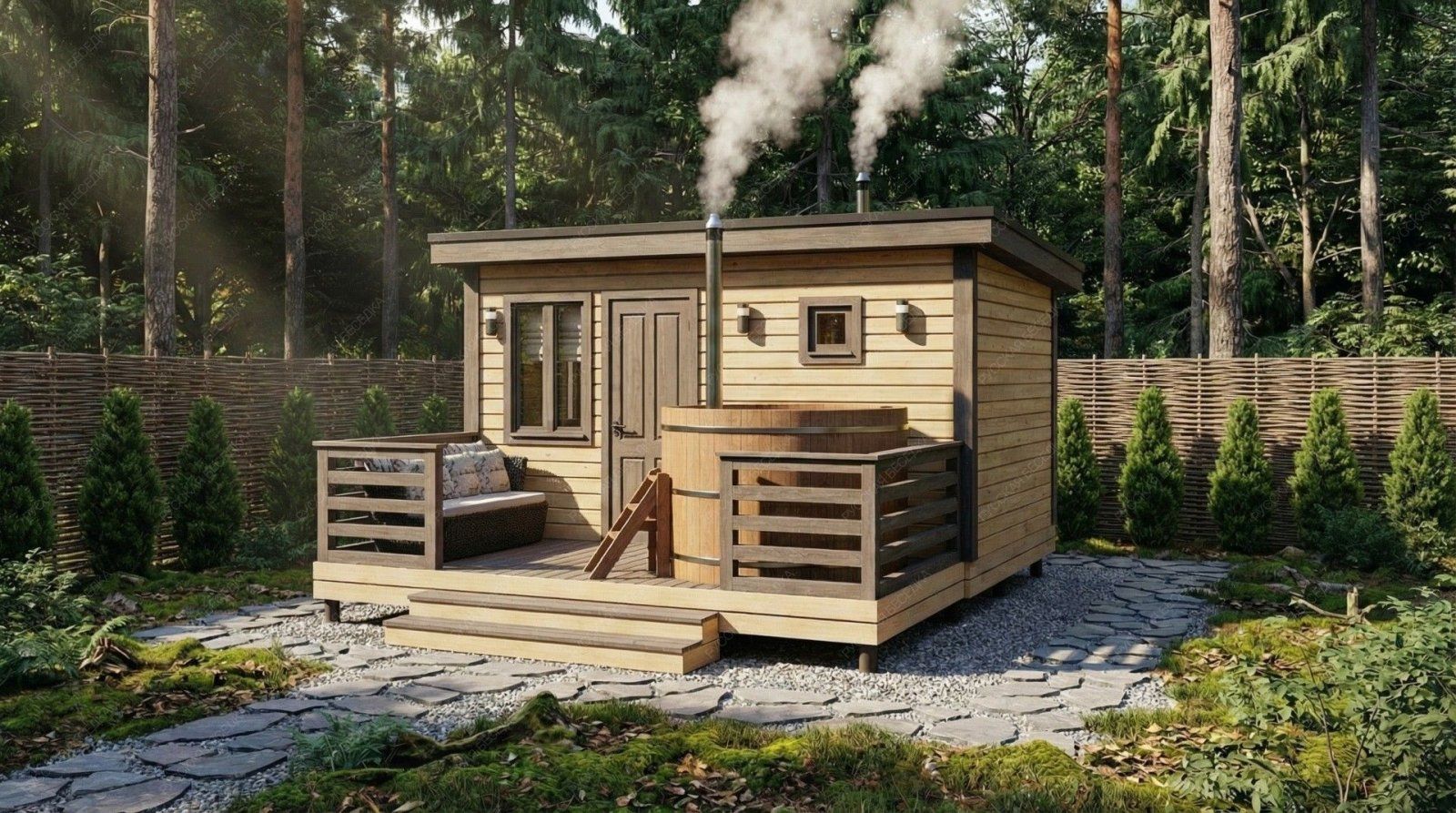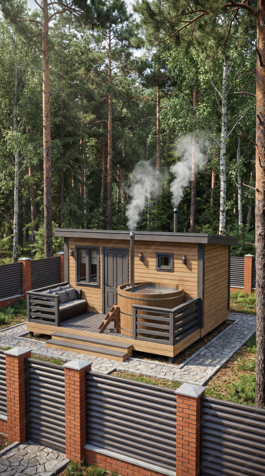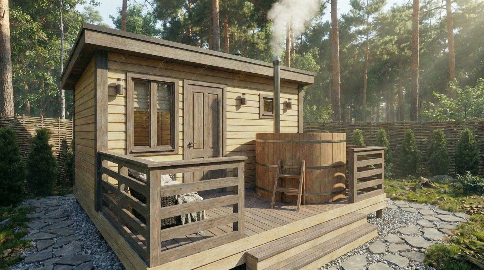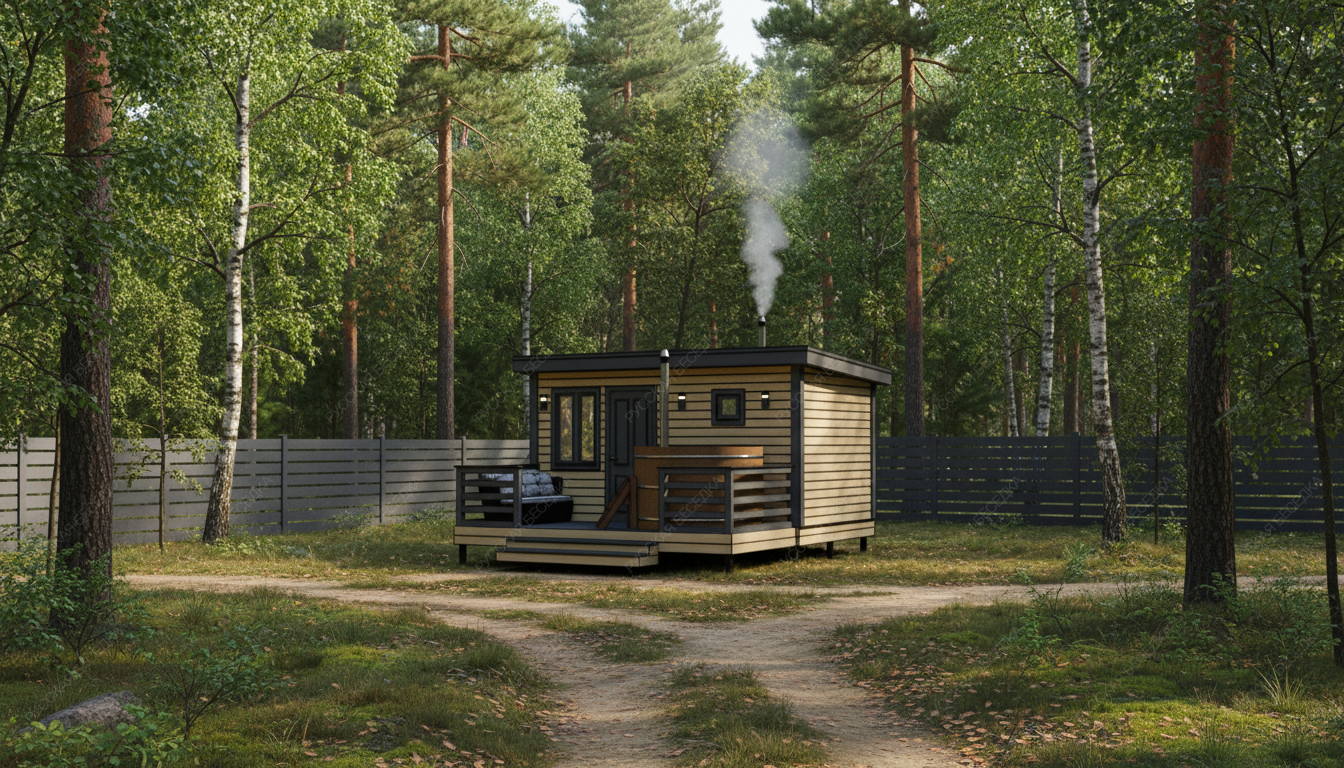 Баня «Аркадия» представляет собой компактное и продуманное до мелочей решение для ценителей традиционных банных ритуалов с элементами современного комфорта. Модель с открытой террасой эффективно использует пространство, создавая многофункциональную зону для отдыха и релаксации на свежем воздухе площадью 8,73 м².  Внутренняя планировка отличается рациональностью: объединенная парная-мойка (5,03 м²) с деревянным окном-форточкой обеспечивает правильный пар и удобство проведения процедур. Уютная комната отдыха (5,98 м²) становится теплым и гостеприимным местом для чаепития и общения после пара. Односкатная крыша и общие габариты (2,95х4,5 м + терраса 2,1х4,5 м) придают строению современный динамичный силуэт, гармонично вписывающийся в ландшафт.  Этот проект идеально подходит для участков, где важна оптимизация площади без ущерба для функциональности и атмосферы. Качество материалов и строительства гарантирует энергоэффективность, долговечность и создание той особой целебной среды, ради которой и строится настоящая русская баня.