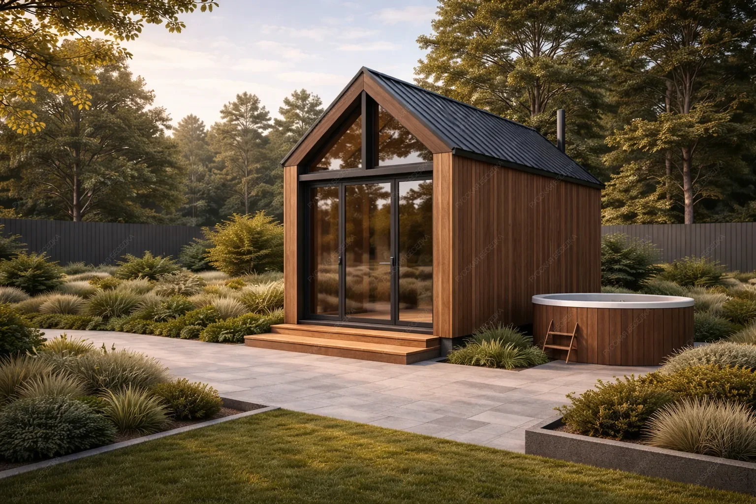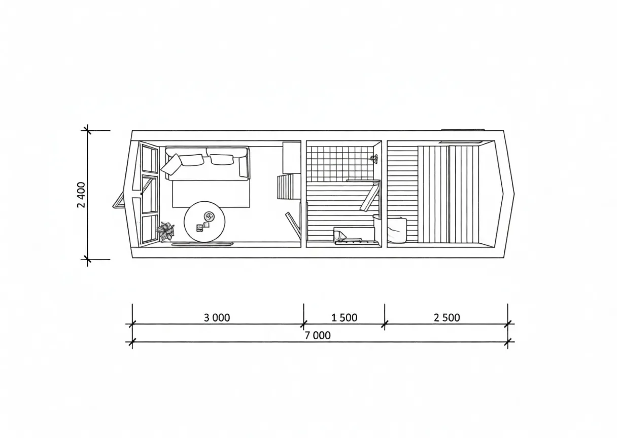 Баня «Кипель» представляет собой мобильное решение в популярном стиле барнхаус, с габаритами 7х2,4 метра и двухскатной крышей. Ее ключевое преимущество — возможность быстрого размещения на участке без капитального фундамента, что идеально для временного использования или в качестве гостевого варианта. При общей площади 26 кв.м. конструкция предлагает полноценную планировку с компактной парной, санузлом, зоной отдыха. Стиль барнхаус проявляется в лаконичных формах, двускатной кровле с характерными свесами и использовании натуральных или фактурных материалов в отделке, что придает строению современный и самобытный вид. Несмотря на минимальную ширину, внутреннее пространство организовано максимально рационально, обеспечивая последовательный переход от парной к отдыху. Данная модель сочетает в себе аутентичность банных традиций, выраженную в стиле, и технологическую практичность мобильных сооружений для современного загородного быта.