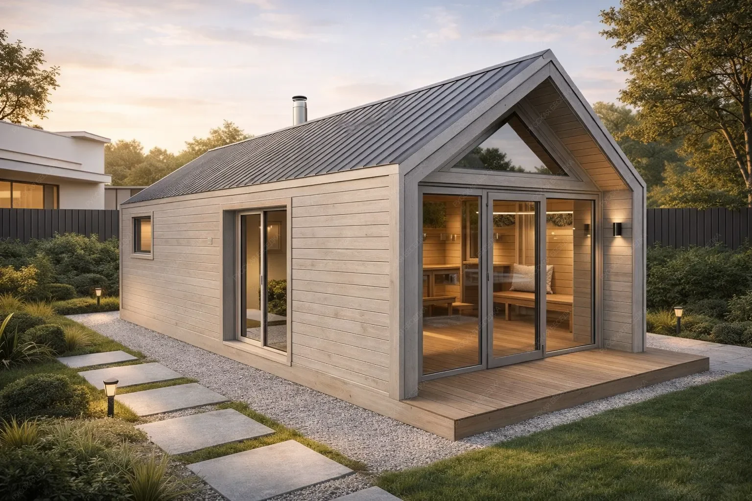 Мобильная баня «Фиата» в стиле барнхаус с габаритами 2,45 x 7,0 метра предлагает концептуальный подход к организации компактного пространства площадью 27 кв.м. под двухскатной крышей. Ключевой особенностью является панорамное остекление в комнате отдыха, которое, контрастируя с общей лаконичностью стиля, создает выразительный визуальный акцент и обеспечивает постоянную связь интерьера с внешним окружением. Архитектурный стиль барнхаус проявляется в строгих геометричных формах, высокой двухскатной кровле и минималистичном фасаде, что придает объекту современную аутентичность. Вход в строение оформлен под защитным козырьком, интегрированным в общую кровельную конструкцию, что добавляет практичности и завершенности внешнему виду. Внутренняя планировка вытянутой формы рационально разделена на функциональные зоны: парную, помывочную, раздевалку и комнату отдыха с панорамным окном. Мобильность конструкции позволяет осуществить быстрый монтаж на подготовленной площадке. Данная модель предназначена для ценителей современной архитектуры, ценящих эффект визуального расширения пространства через остекление, практичность мобильных решений и выразительность стиля барнхаус в условиях ограниченной площади.