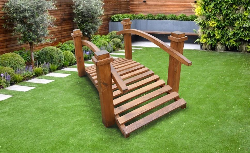 Деревянный садовый мостик — это яркая деталь, которая придаст вашему участку уют и оригинальность. Он станет не только декоративным элементом, но и подчеркнёт ваш вкус и внимание к деталям. Этот мостик изготовлен из качественно обработанных досок и прочных квадратных столбов, что делает его надёжным и долговечным. Идеальный выбор для создания гармоничной атмосферы в ландшафтном дизайне вашего сада.