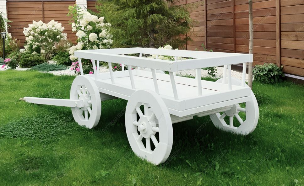 Декоративная деревянная тележка выполнена из сухой строганой доски хвойной породы. Телега может перекатываться с места на место без значительного груза на ней. Телега выполняет декоративную функцию и может использоваться вместе с лошадкой или другой садовой фигурой, или как отдельное изделие. Цвет покраски может быть совершенно разным на выбор.