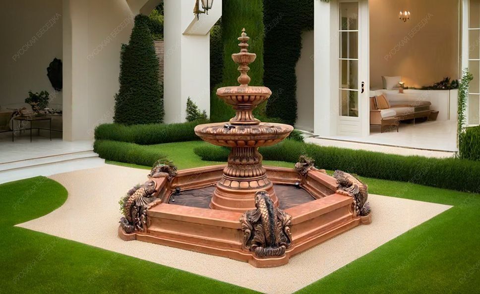 Данный фонтан из линейки «Дворцовых» — наших самых больших и шикарных фонтанов. Отличительная черта этих фонтанов – массивный сердечник весом почти 3 тонны (2 760 кг). Такой фонтан чаще всего устанавливают в городских парках и на площадях. Садовые фонтаны становятся все более популярными на фоне активного строительства частных домов. Большинство наших фонтанов имеет размеры до двух метров в диаметре, цельный бассейн и декоративный сердечник. Однако, нередко к нам обращаются владельцы крупных домов, резиденций. Им нужен не просто декоративный фонтан, а настоящий яркий символ статуса. Для них мы подготовили отдельную комбинацию – Дворцовый фонтан. Это роскошь, грациозные линии, монументальные размеры. Такую красоту видно издалека. Тематика фонтана напоминает нам о традиционных героях русских сказок. Углы шестиугольного бассейна украшают фигуры рыбок. Из пасти каждой рыбки бьёт струя в центральную ножку сердечника, образуя красивый водяной каскад. В середине установлена мощная опора, украшенная резным декором. На опоре расположена огромная чаша, с изящными изгибами, с которых постепенно стекают тонкие струи воды. Система имеет два водяных контура – на рыбок и на сердечник. Рисунок воды всегда можно изменить на другой, поменяв насадку в чаше. Девять мощных подводных диодных светильников провоцируют увлекательную игру светотеней после захода солнца. Подсветка включается с пульта дистанционного управления.