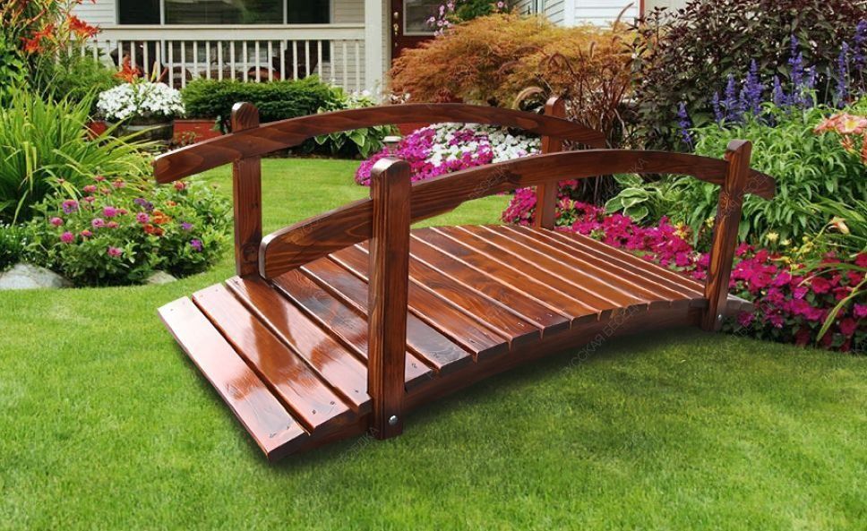Имеющиеся неровности на загородном участке или небольшие водоемы можно украсить интересным ландшафтным элементом – мостиком. Мостик из дерева очень уместен на загородном участке, поскольку он олицетворяет собой всю красоту естественной природы. Хорошо, если мостик будет установлен там, где посажены цветы и много растительности. Лакированный деревянный мостик будет привлекать восторженные взгляды гостей и соседей. Деревенский мостик для дачи как на фото выполнен из дерева породы сосны.