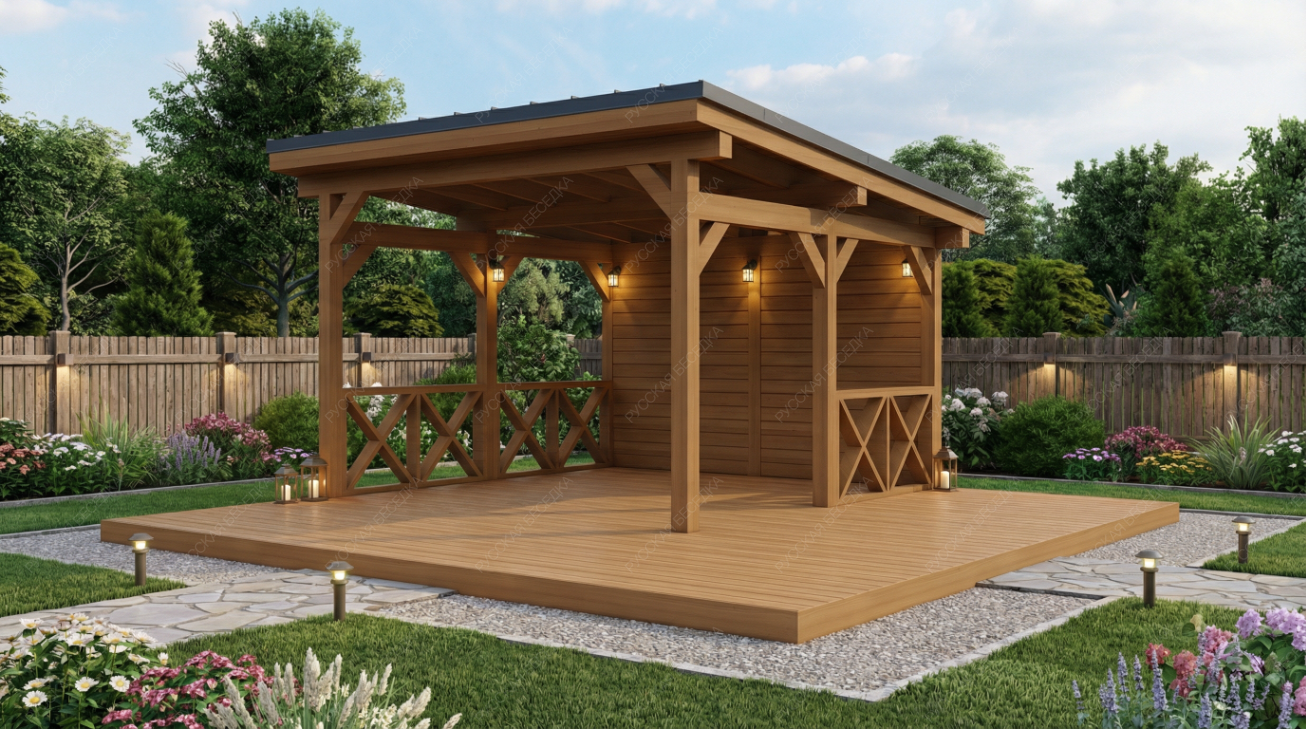Квадратная беседка «Снэйк» с фальцевой кровлей — это архитектурное решение для загородного участка, где основным материалом выступает массив хвойных пород (ель, сосна) камерной сушки. Общая композиция размером 6х6 метров объединяет закрытую часть 3,95х3,86 метра и открытую террасу, формируя пространство для отдыха общей площадью 36 м², рассчитанное на компанию до 15 человек. Односкатная крыша с фальцевым металлическим покрытием обеспечивает надежную защиту от осадков и придает строению лаконичный современный силуэт.