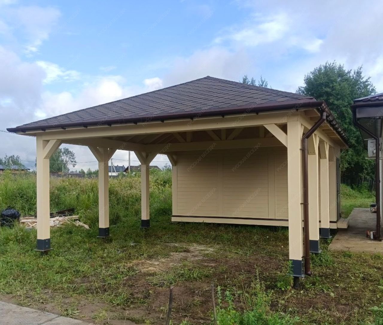 Навес из дерева послужит отличным парковочным местом для одного или нескольких автомобилей.