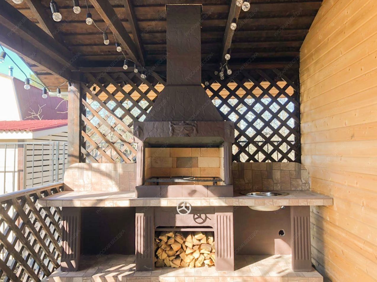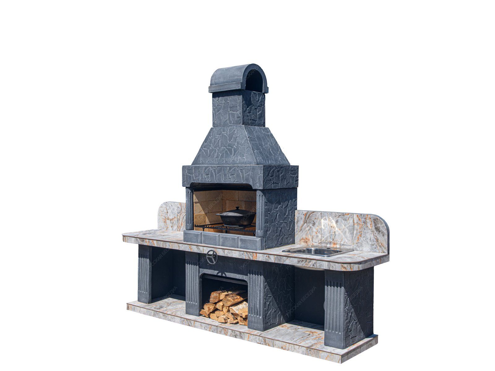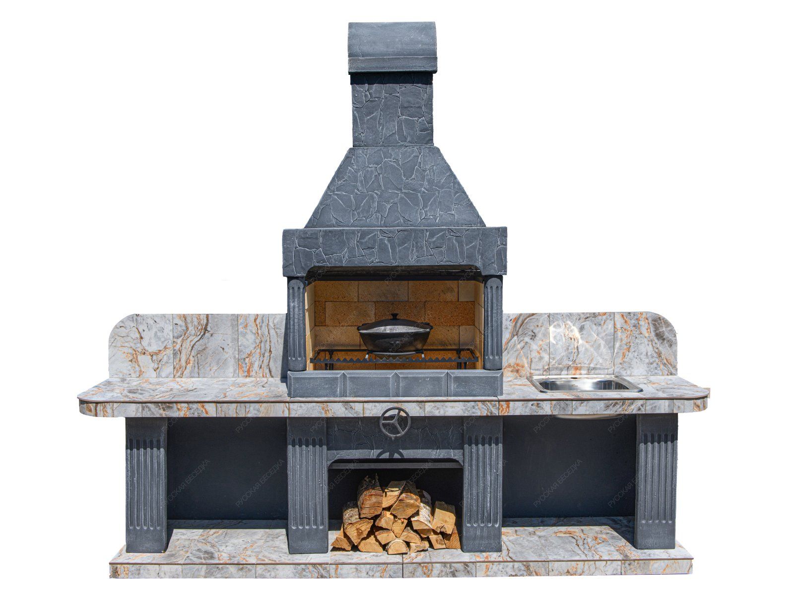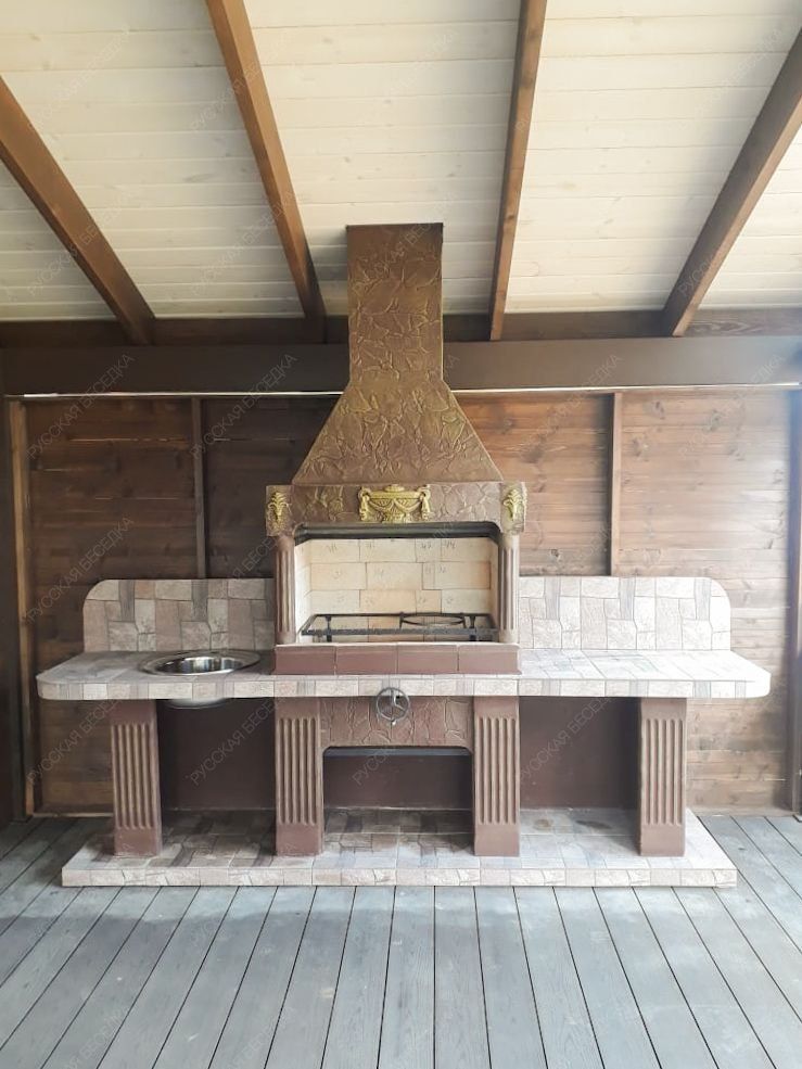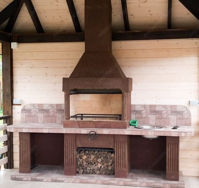 У этой модели две большие столешницы — равноценные площади по бокам от топки. На одной из них логично установить раковину, потому что к такому комплексу необходимо проводить воду. Вторую столешницу или оставляют без изменений, или дополняют другим функционалом.