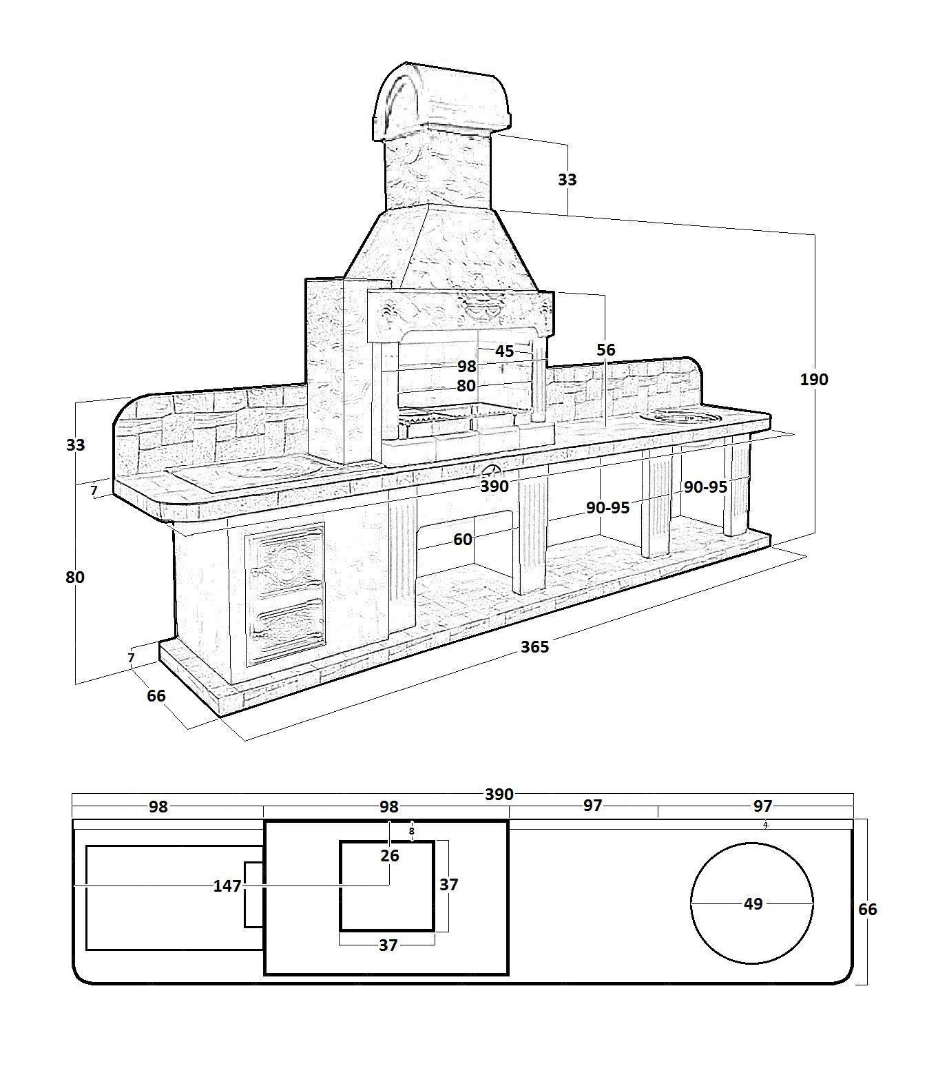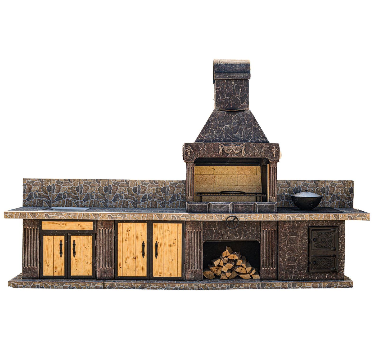 Печь-барбекю этой модели представляет собой полноценную кухню — вам остается только провести воду для использования встроенной раковины. У конструкции есть открытая топка и плита, работающая от закрытого огня, так что вы можете готовить почти все блюда. Исключением станут только те рецепты, для реализации которых нужна полноценная духовка. В остальном изделие ничем вас не ограничивает.