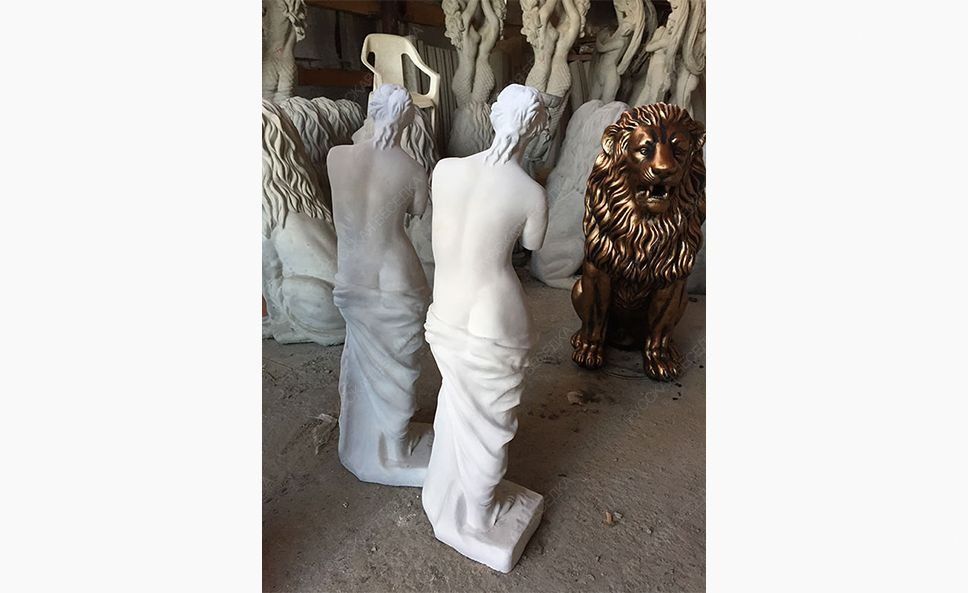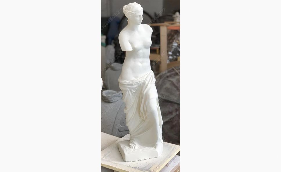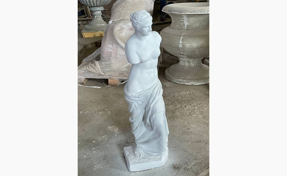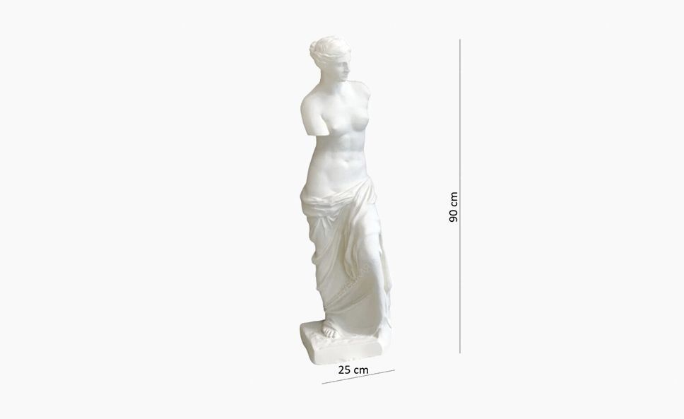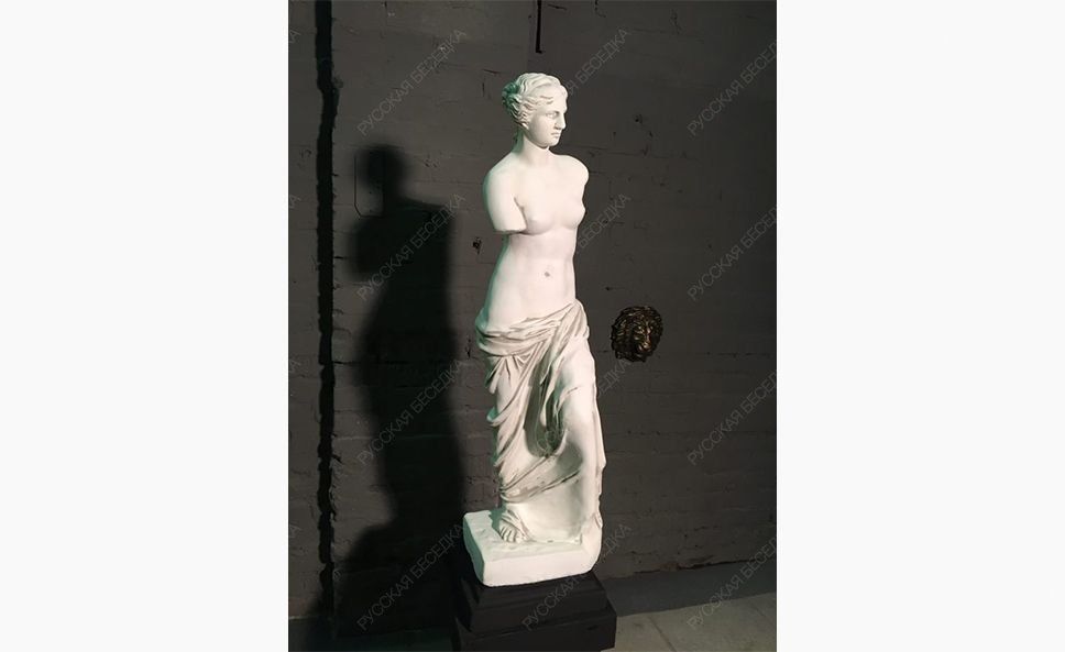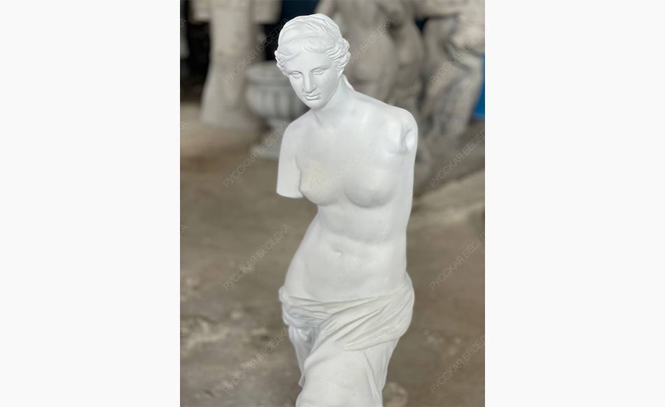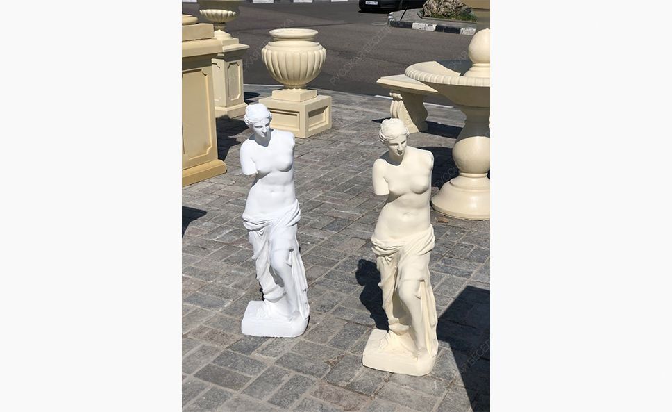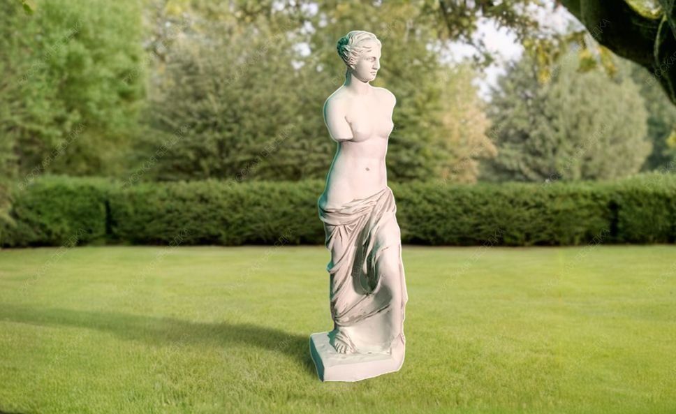В скульптуре «Венера Милосская» мастера в точности воссоздали все детали античного шедевра. Богиня Венера — покровительница красоты, любви, желания, плодородия и процветания. О ней мечтали не только люди, но даже боги. Уменьшенная копия древнегреческой богини станет достойным украшением интерьера или садово-паркового ландшафта.                                                    Полуобнаженная фигура, сильная и одновременно женственная, – такой изобразил скульптор Венеру, богиню любви. Мягкие складки одеяния подчеркивают красоту и упругость обнаженного тела. В зависимости от того, откуда смотреть на статую, она кажется то гибкой и подвижной, то спокойной и сосредоточенной. Удивительную жизненность придает богине и посадка головы: немного влево и чуть вниз. Скульптура античная Венера Милосская станет достойным элементом ландшафтного дизайна и центральной фигурой Вашего сада в Москве в классическом регулярном стиле. Оригинальная декоративная отделка наделяет статую благородным шармом старины, подчеркивает выразительность ее рельефа и позволяет с нового ракурса взглянуть на достоинства известной скульптуры. Венера в белом цвете впишется в любой классический интерьер. Особенно выразительно скульптура будет смотреться в просторных фойе, помещениях с высокими сводами, залах кафе и т. д. Разместив скульптуру в тени деревьев, образ древнегреческой богини приобретет лирический ореол таинственности. Установив Венеру на открытом месте, она окажется центром притяжения всеобщего внимания, своеобразным стержнем, вокруг которого будет выстраиваться вся ландшафтная композиция. Отливка скульптуры производится методом вибролитья, что обеспечивает равномерную усадку и однородную структуру застывшего материала. Мы используем высокопрочный бетон, усовершенствованный путем добавления специальных присадок. Отделка с применением проверенных грунтов и фасадных красок подготавливает скульптуру ко всем неблагоприятным факторам при использовании на улице.